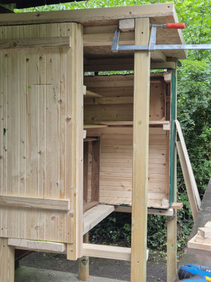 In Walldorf war es an der Zeit, unser Insektenhotel weiter zu bauen. So bauten wir das Grundgerüst und das Dach fertig und strichen noch die restlichen Wände. Ebenso reparierten wir ein