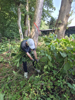 Mit Ruth habe ich außerdem den Eidechsenhaufen auf einer Fläche von störendem Bewuchs befreit und wir haben auf verschiedenen Flächen Müll gesammelt und giftige Pflanzen entfernt, bevor diese dann gemäht werden. Auch Brombeeren und andere Aufwüchse mussten wir noch entfernen.